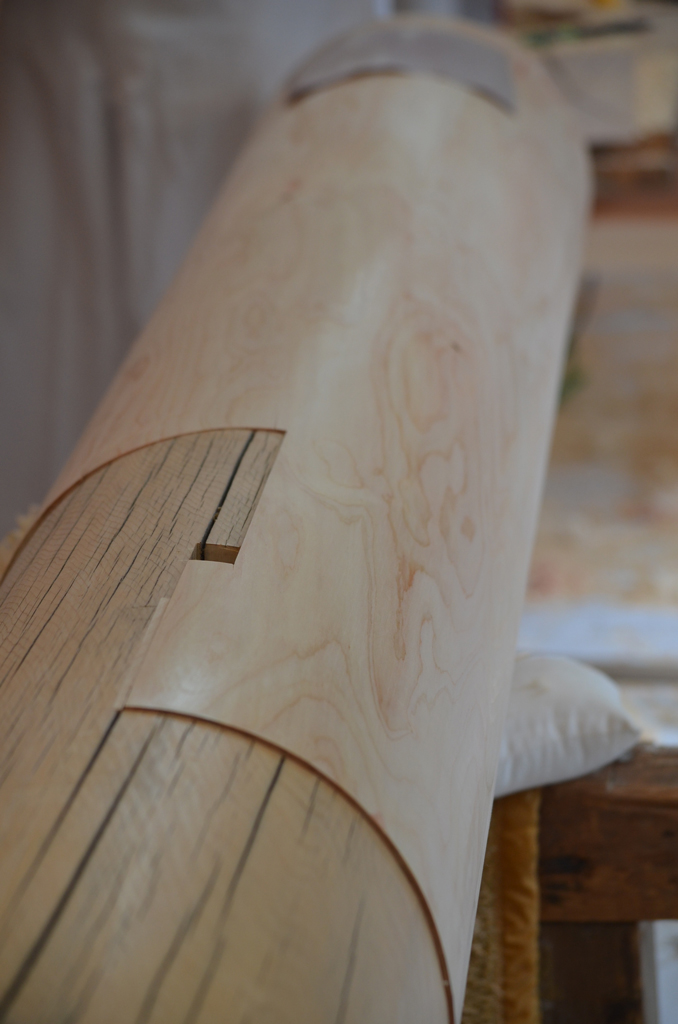 伐採から約30年が経過している伊勢の古材と切り出したばかりの小田原の新材との根継ぎは、宮大工らによって今後の収縮具合も想定され、建立時にはおよそ3mmほど大きい丸材となっています。およそ5年ほどで古材と同じ大きさになる予定です。